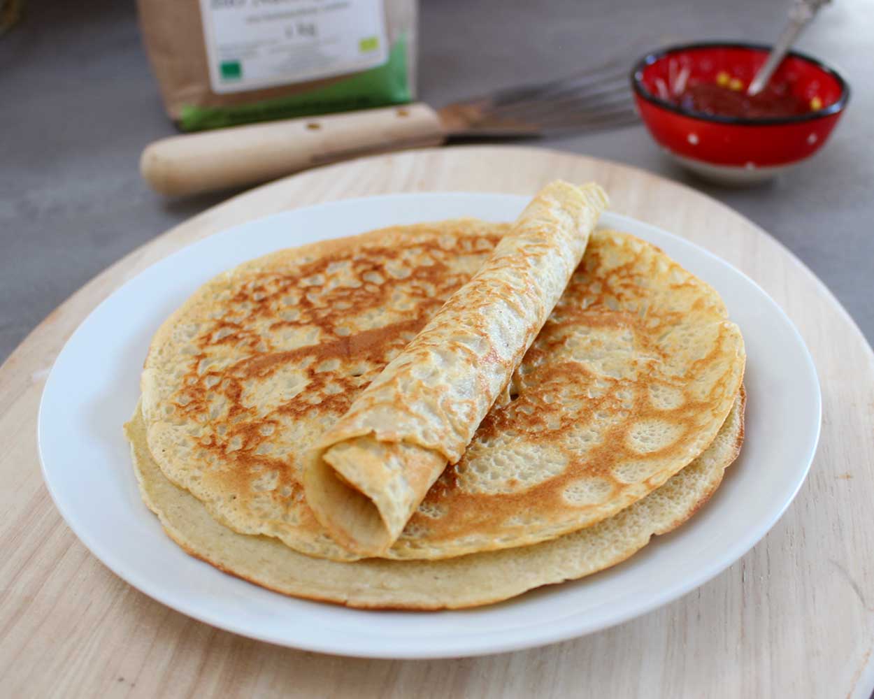 Die Pfannkuchen können auch mit Wasser/Pflanzendrinks statt Milch oder anteilig mit Wasser zubereitetet werden.